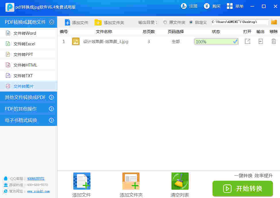 软件的操作也很简单,用户只需要打开软件后,在左侧功能区选择“文件转图片”功能模式,然后将需要转换的pdf文件添加到软件界面列表,点击“开始转换”即可轻松完成pdf和jpg文件的转换工作。