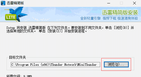 1、从51下载下载迅雷精简版安装包,并用鼠标左键双击打开此文件,进入安装程序。首先点击“浏览”按钮选择迅雷精简版的安装目录,此处不建议安装在C盘,如果C盘文件过多的话,会影响计算机的运行速度。选择完成后点击“安装”即可。