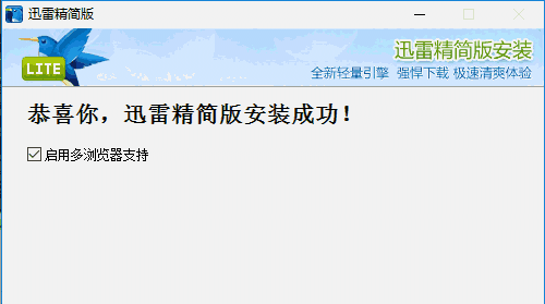 3、安装结束后,会自动跳转至安装成功界面。如果勾选上“启用多浏览器支持”选项的话,会在浏览网页点击右键时,出现一个额外的“使用迅雷精简版下载”选项,下载更方便。选择完成后点击“关闭”按钮即可。