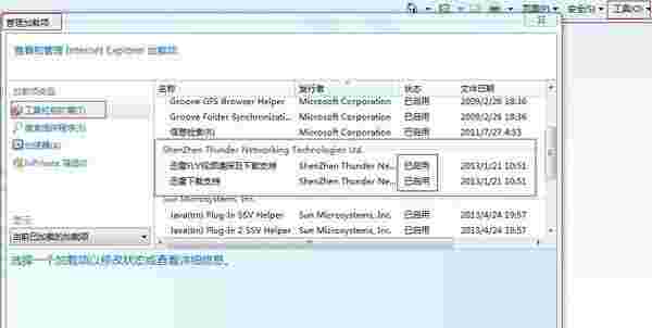 2、打开360浏览器或者其他浏览器——【工具】——【internet选项】——【程序】——【管理加载项】——查看是否有启动迅雷的加载项