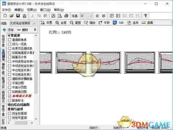 3、纵断面。可以进行纵断面的设计、计算。竖曲线计算方式可以选择传统或精确算法。提供纵坡及竖曲线表、纵断面高程计算表、绘制完整的纵断面图,可以按任意纸张分页。