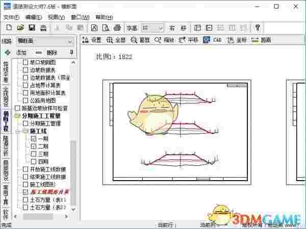 2、分期施工工程量:任意添加、删除施工线,计算任意两期施工线间的方量,生成图形并分页打印。