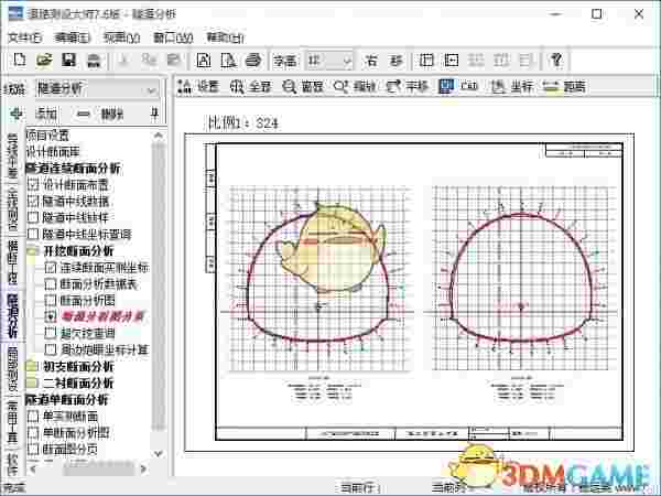 隧道断面分析提供各断面实测点的超欠挖值及超欠挖面积,计算周边炮眼坐标。软件自动生成隧道断面分析图形。