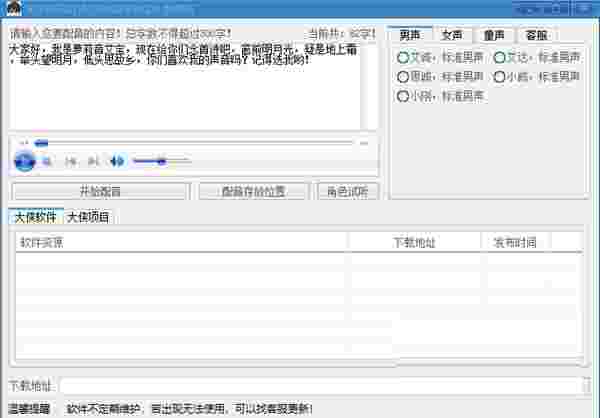 配音小助手是一款专业的语音朗读文字的工具软件。软件的使用方法很简单,你可以将需要的文字、词句、段落、文章输入进输入框。之后可以选择不同的声音包括男声、女声、童声朗读输入框中的内容,还是非常方便简单的。