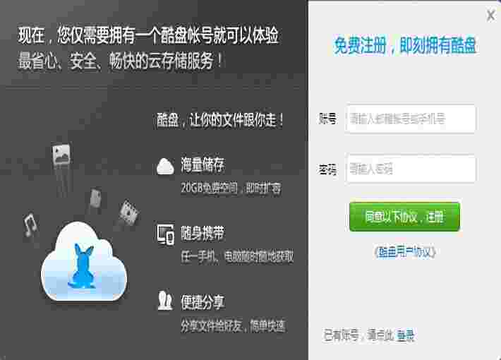 酷盘注册后提供5GB容量,用户可邀请好友注册酷盘,最多将获得15G空间。酷盘不限单个文件大小,可在线上传下载文件,使用客户端随时随地同步文件,多重加密、多重备份、不同终端相互分享。