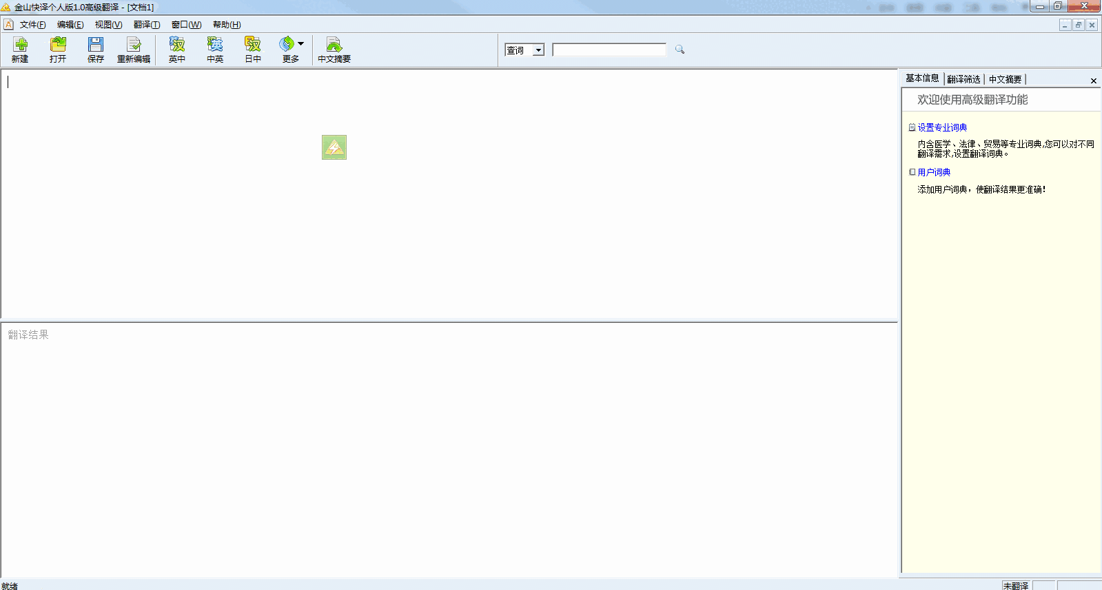 金山快译的高级翻译采用全新的多语言翻译引擎、全新的翻译界面。不仅扩充了翻译语种的范围,有效提高了高级翻译的质量;用户可以通过高级翻译选择专业词典、用户词典进行翻译,也可以进行翻译筛选、中文摘要翻译,同时在易用性方面也有了很大的提高。