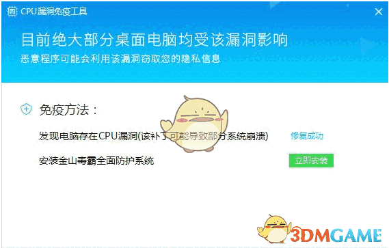 2. 发布CPU漏洞免疫工具:由国外安全机构披露的CPU“Meltdown”(融化)和“Spectre”(幽灵)两组CPU漏洞,引发全球关注。漏洞几乎影响所有桌面电脑、笔记本和服务器,攻击者利用漏洞可以获得本该被系统保护的信息。 金山毒霸已紧急推出“CPU漏洞免疫工具”,漏洞修复、安全防护双管齐下,以阻断攻击者利用漏洞入侵的通道。该工具可一键检测电脑是否存在CPU漏洞,为存在CPU漏洞影响的系统安装安全更新,以免疫CPU漏洞。