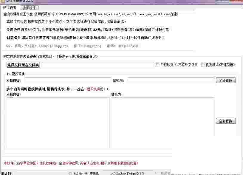 金浚文件批量重命名是一款专业的文件批量重命名的工具软件。软件可以帮助使用者对文件进行批量重命名,软件的使用方法也很简单,选择文件夹,输入替换之前的的内容和替换后的内容,点击全部替换就完成了内容替换的操作。