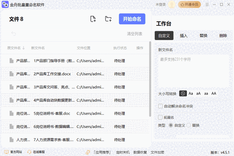 金舟文件批量重命名软件是一款专业的文件批量重命名的工具软件。支持一键添加修改多个文件名字并可为文件名自动添加数字序号等。十分方便快捷,界面简约,布局直观清晰,操作简单,极易上手,是一款不可多得的利器。