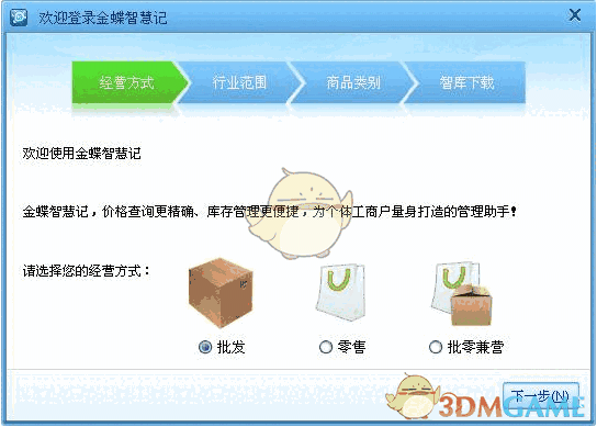 2.如果您首次登录,则会出现配置界面,选择经营方式,然后点“下一步”。