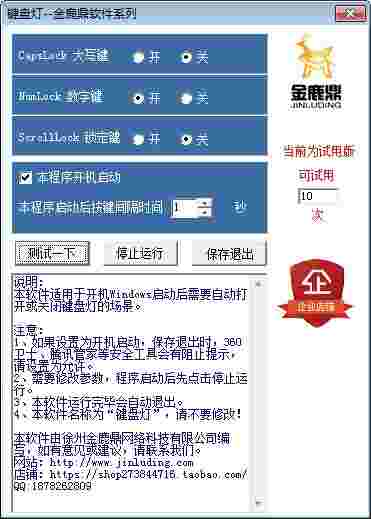 金鹿鼎键盘灯是一款专业的控制键盘灯的软件工具,你可以通过软件可以自定义键盘指示灯是否开启。操作非常方便快捷,软件界面简约,布局直观清晰。很容易上手,是一款十分实用的工具。