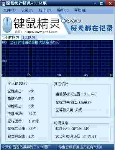 键鼠统计精灵是一款键盘鼠标统计记录软件,支持统计记录每天鼠标左键点击、右键点击、中键点击、中键滚动、鼠标运行、鼠标共点击、键盘功敲击的数据