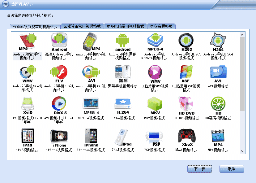 支持Android手机官方所支持标准视频格式3GP、3G2、MP4、MPEG-4、MP4-AVC (H.264)、H.263视频格式转换。