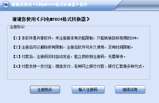 闪电MPEG4格式转换器为免费试用后可付费软件,无捆绑软件。