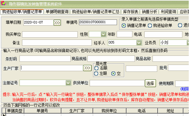 进货管理:用户可以对隐形眼镜的进货情况进行录入、修改、查询和删除,并可以设置进货折扣率,计算进货成本和利润。