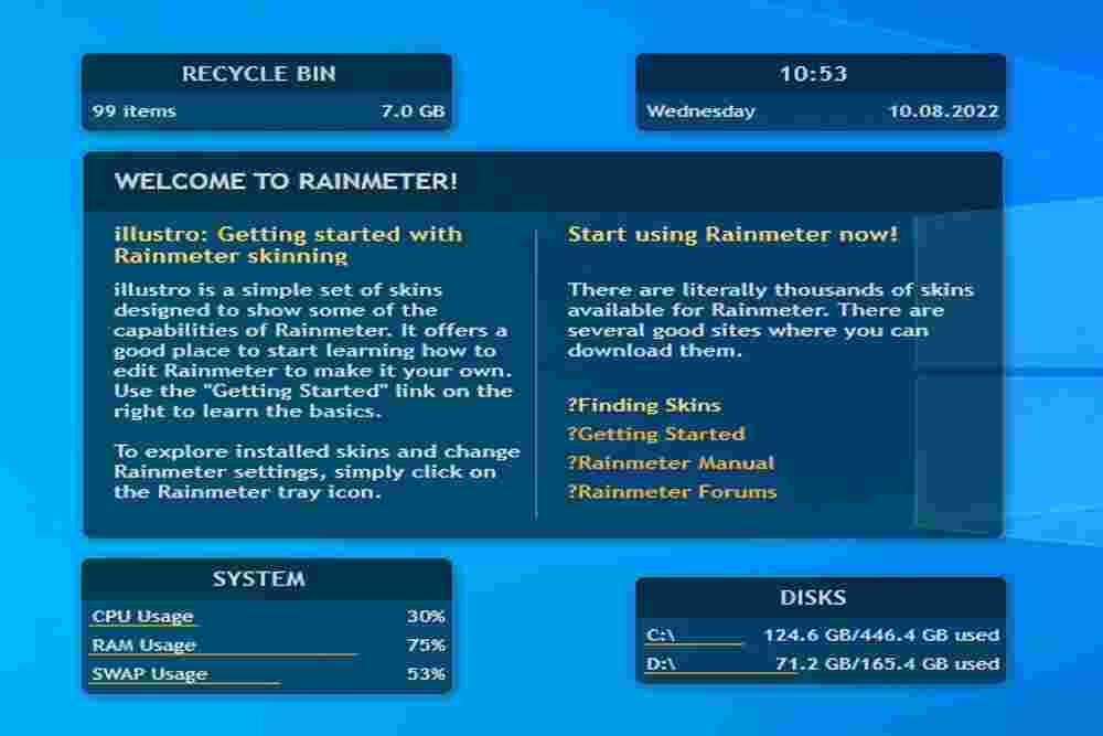 现在雨滴桌面(Rainmeter)主打的皮肤,典雅的设计搭配很强大的主窗口,确实很容易上手。主窗口亮蓝色的部分点击可以打开对应的组件,暗蓝的部分用来切换组件的大小。中央的设置按钮可以方便地设置几个组件所需的变量。另外新加入的主题管理器RainThemes里面存了三套界面设置方案,不妨尝试一下。