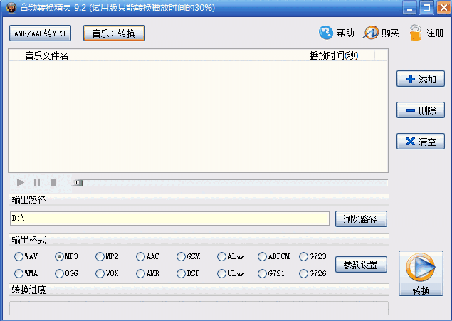 音频转换精灵支持CD抓轨功能,能将CD光盘上的音乐转换为MP3、OGG、WAV、WMA。