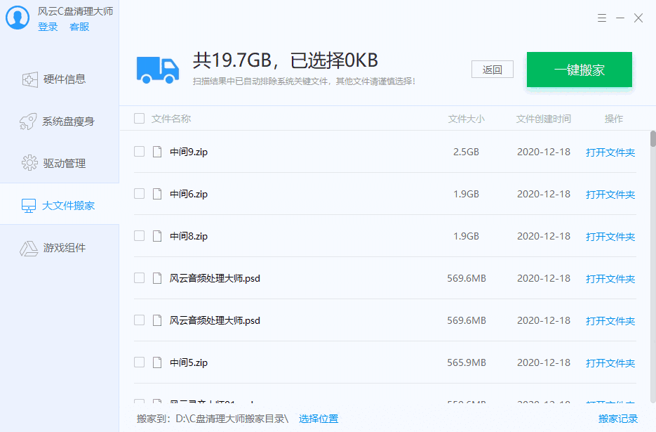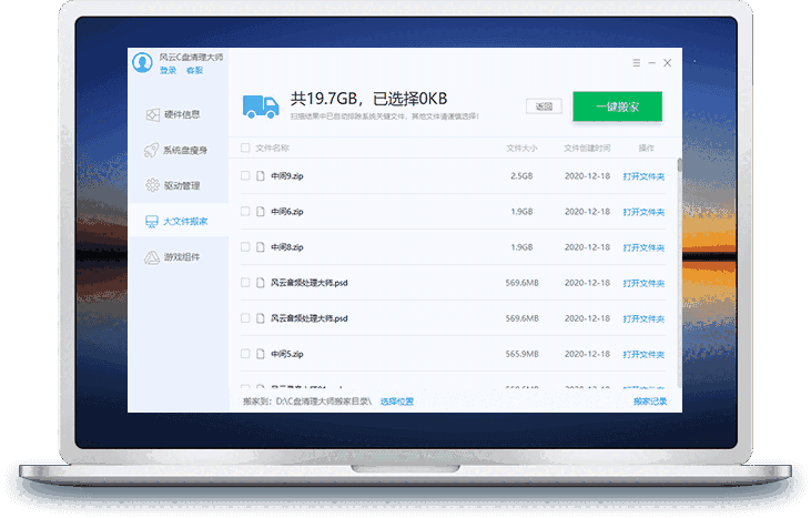 风云C盘清理大师支持大文件搬家,节省空间,一键操作即可将电脑C盘内的大文件进行迁移,加快运行速率。