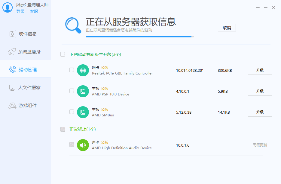 风云C盘清理大师支持驱动管理,自动修复升级,一键即可检测电脑内驱动情况,自动下载修复安装。