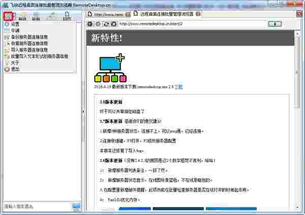飞哈远程桌面连接是一款专业的远程连接的软件工具,软件支持一键打开一组服务器,批量管理Windows服务器等功能。非常方便快捷,软件界面简约,布局直观清晰。操作简单,容易上手,是一款十分实用的工具。