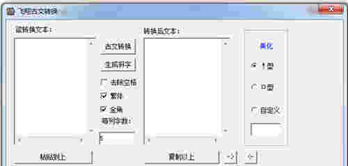 飞翔古文转换器是一款专业的普通汉字转换为古代竖排版的繁体字的工具软件,支持一键复制粘贴以及美化。并且支持转换倾斜的字体。十分方便快捷,界面简约,布局直观清晰,极易上手,是一款不可多得的利器。