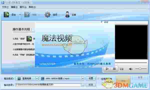 输出格式:H264、MP4、AVI、WMV、MPEG4、MKV、MPG、3GP、RM、RMVB、MOV、FLV、F4V、TS、MTS、M2TS、MOD、VOB、WEBM、ASF、DVD等
