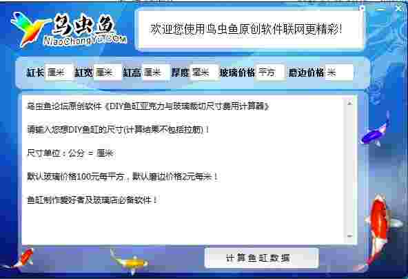 鸟虫鱼DIY鱼缸计算器是一款专业的鱼缸价格的计算工具软件。软件可以帮助使用者快速计算需要定制尺寸鱼缸对应的价格。软件的界面非常简洁。使用方法也很简单,在软件的鱼缸尺寸中输入你想定制的尺寸参数,设定好玻璃价格,最后点击计算鱼缸数据即可。