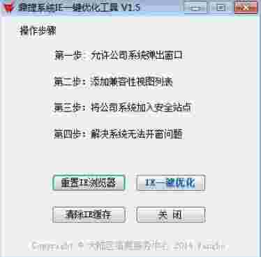 鼎捷系统IE一键优化工具是一款专业的ie浏览器优化的软件工具,软件支持优化ie的不兼容系统以及漏洞,支持修复ie主页、ie标题等等。非常方便快捷,软件界面简约,布局直观清晰。操作简单,容易上手,是一款十分实用的工具。