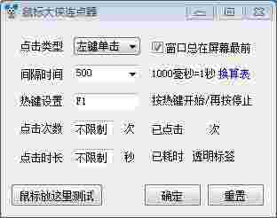 您只需要选择你需要的功能,例如单击双击,左键右键,点击时间以及间隔时间。最重要的是我们的鼠标连点器可以任意设置您觉得使用方便的快捷键,例如F1,F10等等。