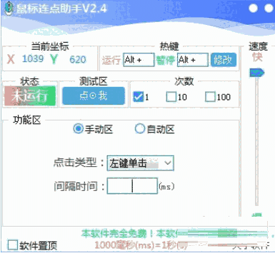 手动点击:选择手动区、设置间隔时间(不设请留空)、按运行热键开始。