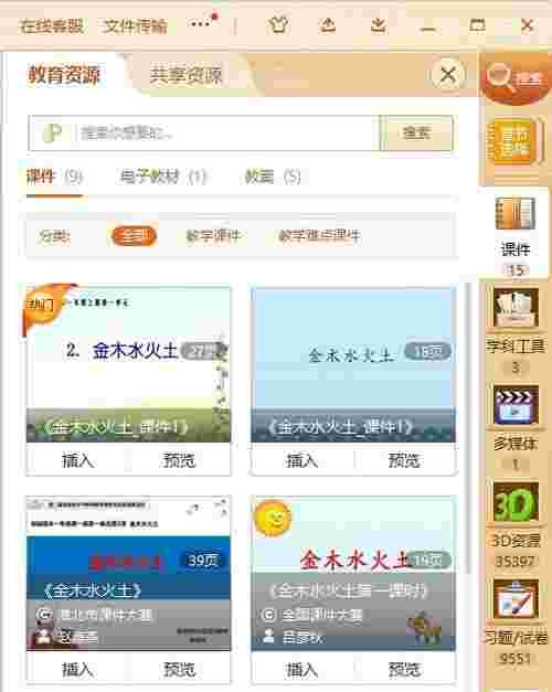 3、软件右侧栏会给出现成的教学资源,直接导入使用,比如说课件,教案和电子教材。