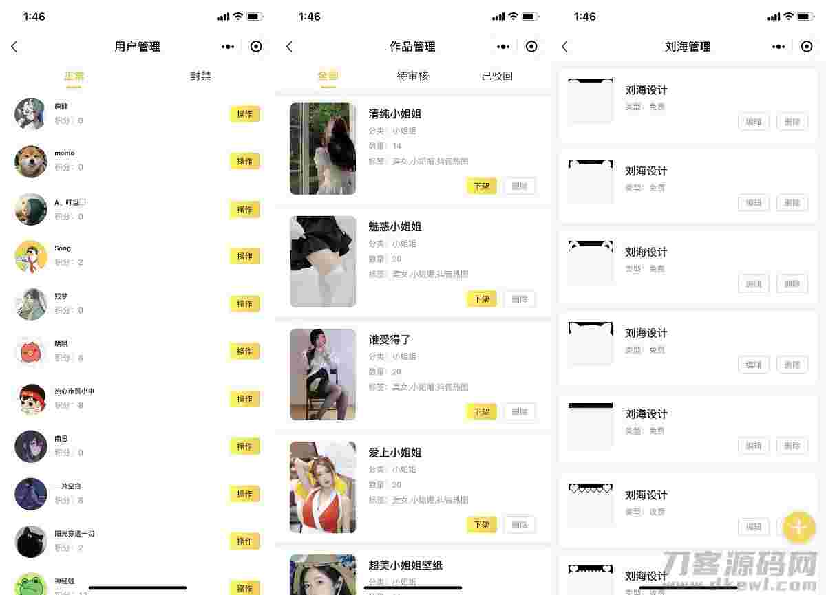 特点:支持用户投稿,后台审核后会发订阅消息给用户提示作品审核状态,增加用户粘性,支持后端修改/增加轮播图