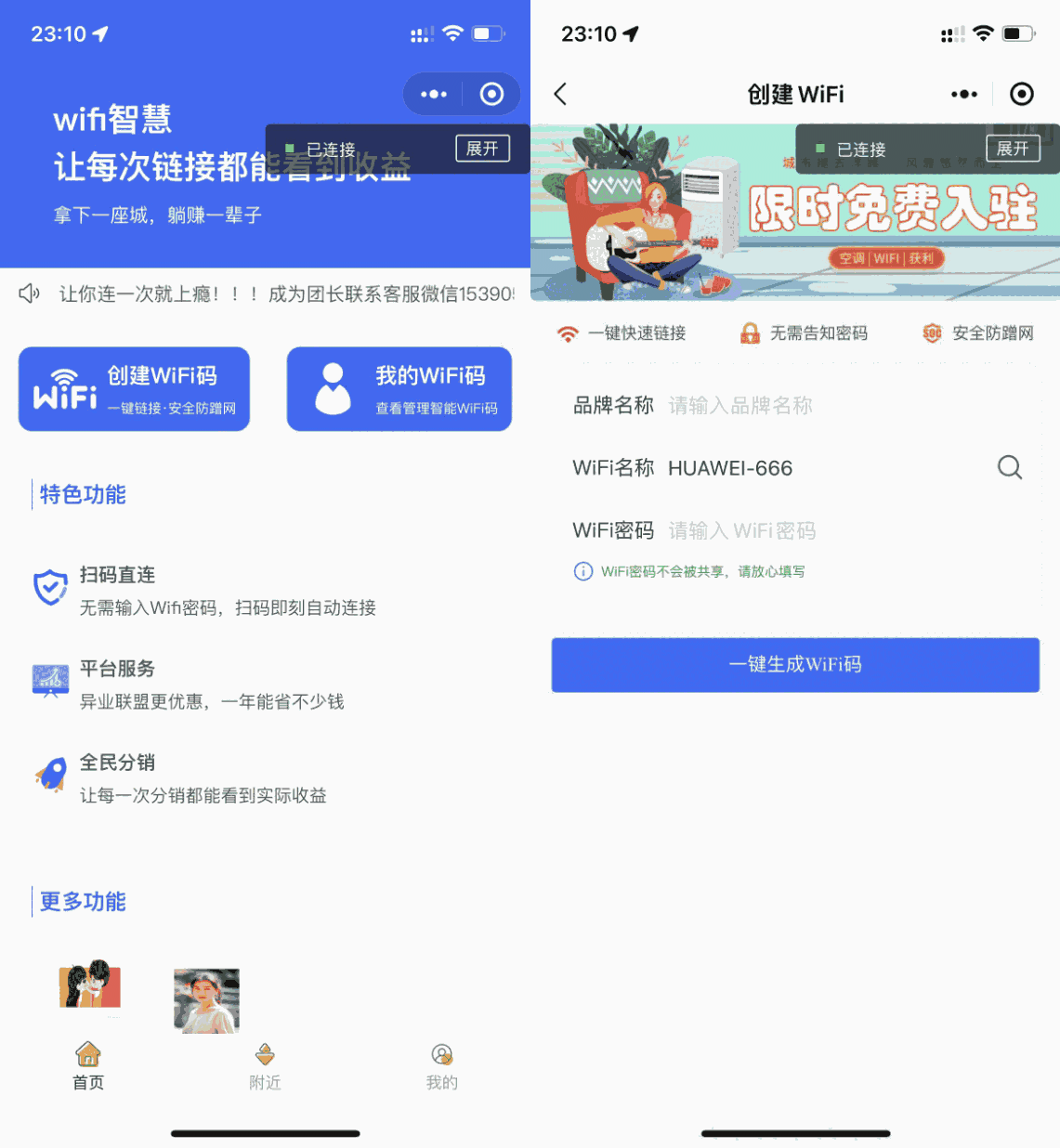 用户到商家扫码链接Wi-Fi,就可以得到流量主分成,商家Wi-Fi本身是免费的,用户也不需要花钱,这时候商家还能赚钱。