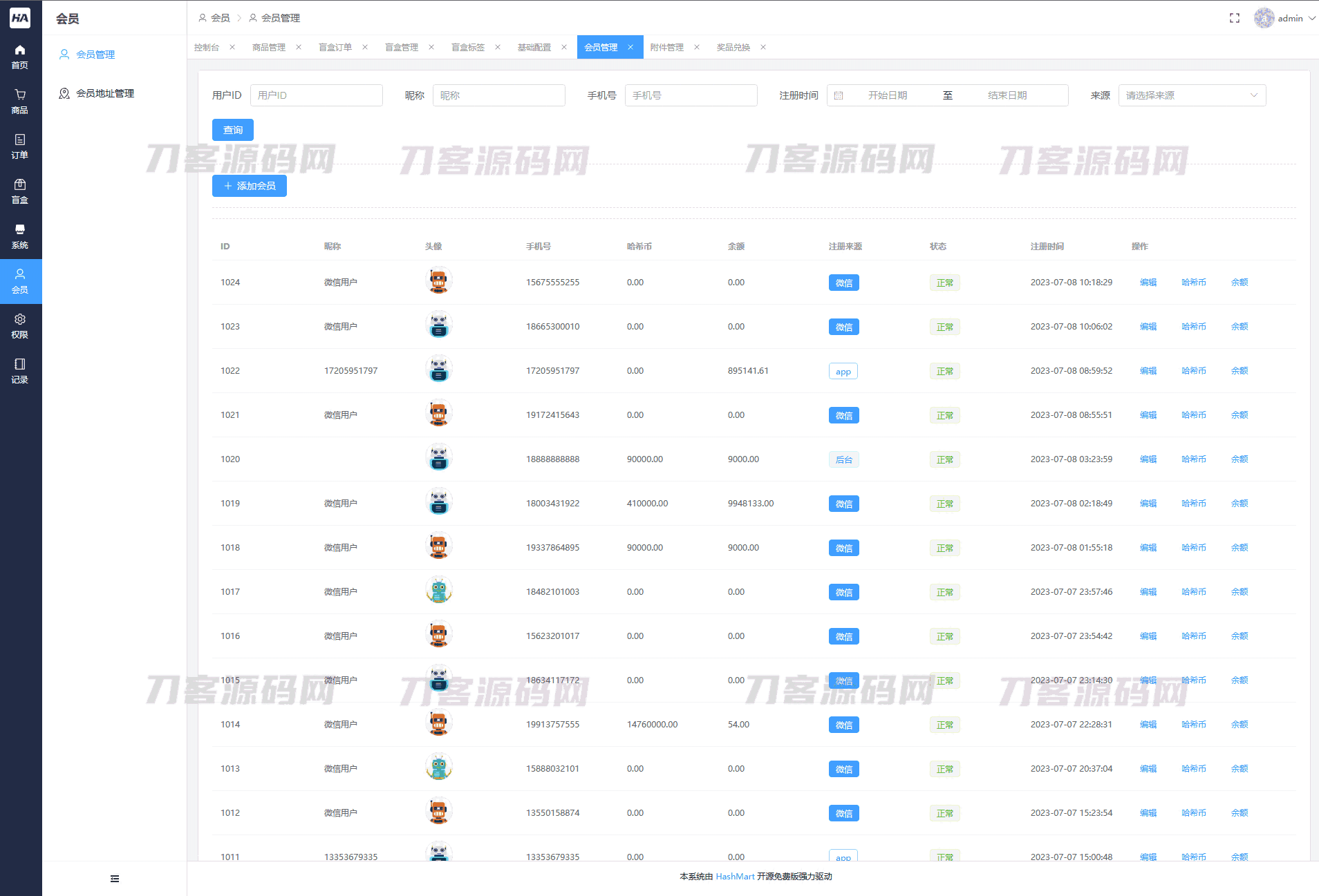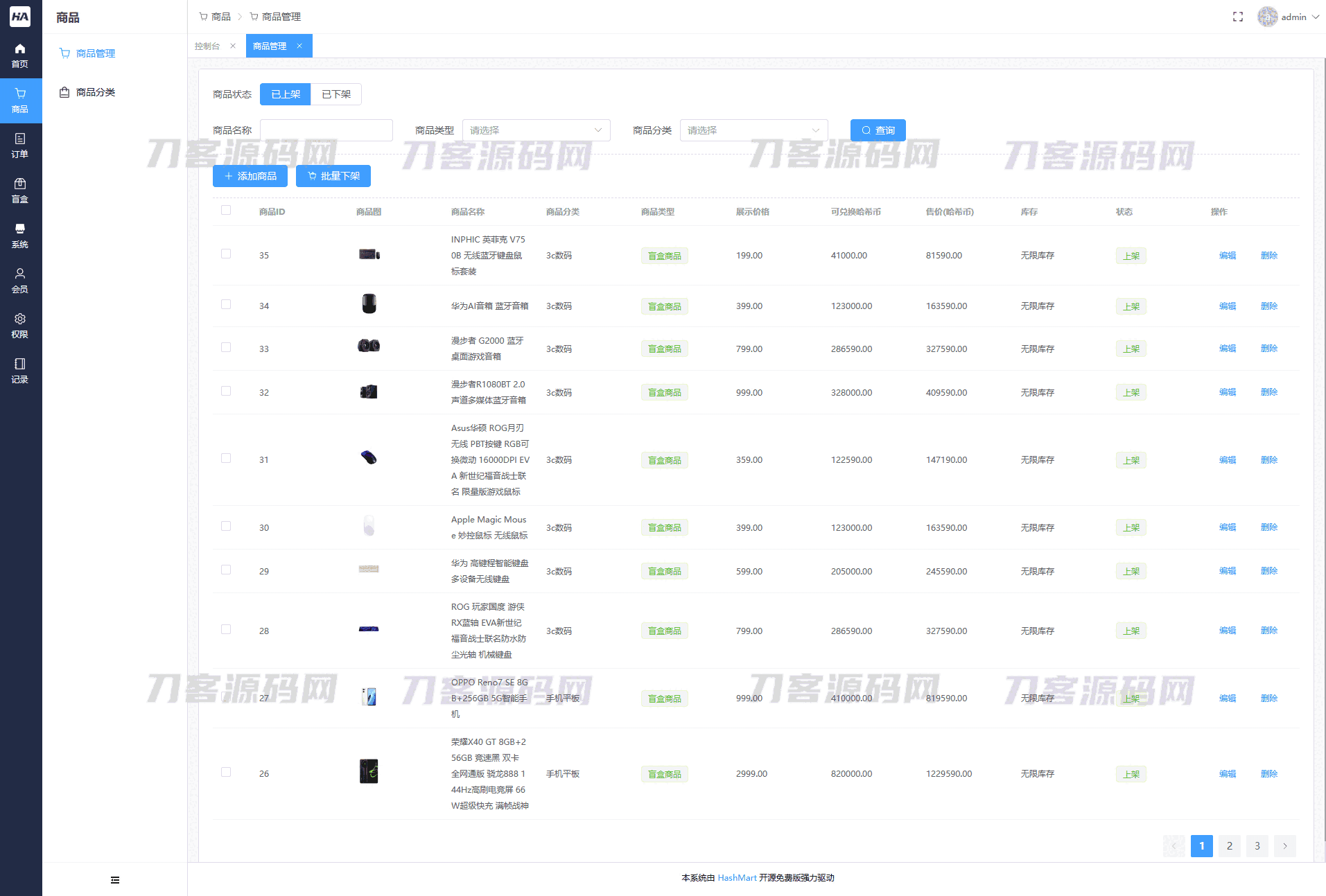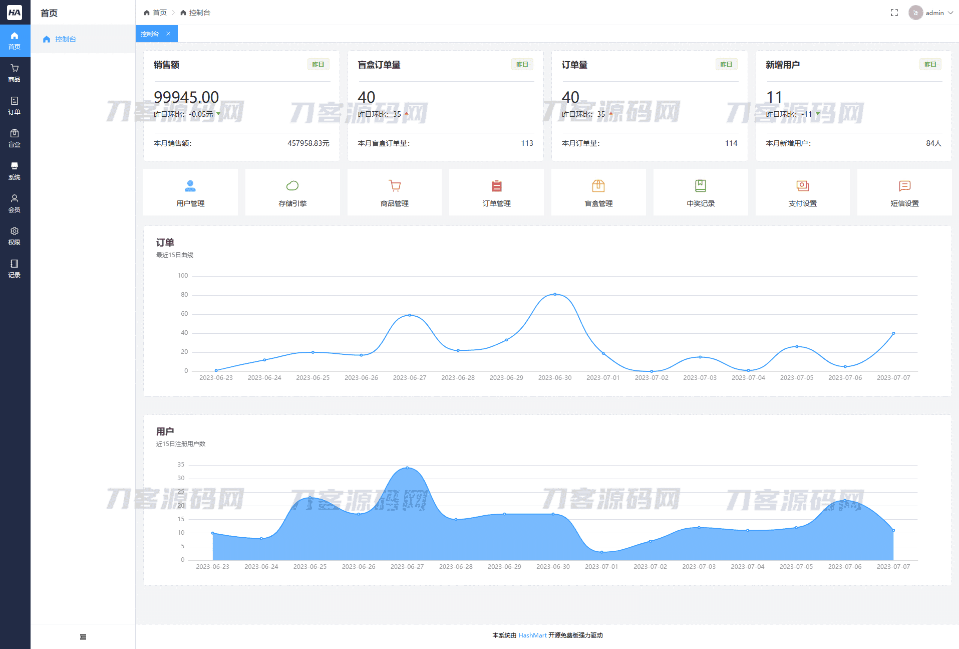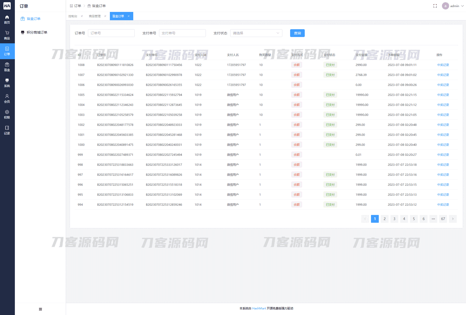 HashMart(哈希玛特)是首款开源的面向生产的高性能、易开发的盲盒系统。它包含:首页看板、商品管理、订单管理、盲盒管理、系统管理、会员管理、权限管理、记录管理,并且拥有完善的搭建使用手册和接口文档。是帮助您快速落地盲盒商城系统的不二之选。