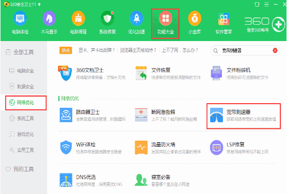1、打开360安全卫士界面,打开【功能大全】,在左侧选择【网络优化】,点击【宽带测速器】,软件会自动测试你的网速,最后等待测试结果即可。
