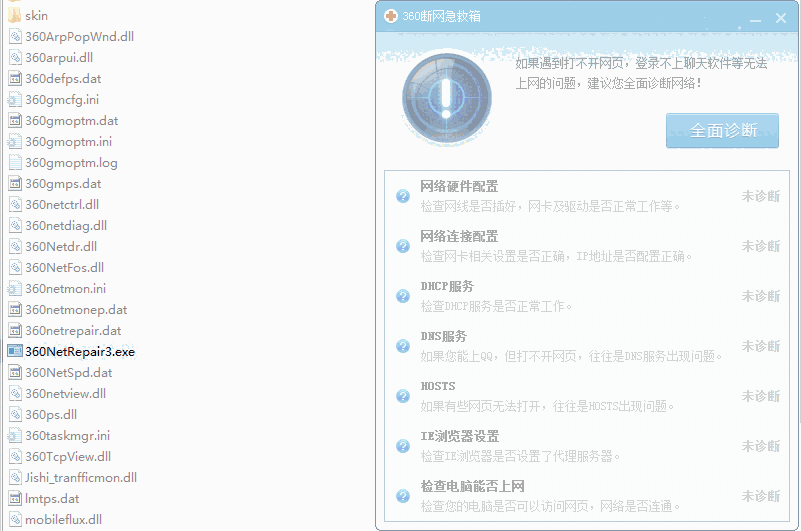 2、将360断网急救箱软件包下载至本地后双击将其完整解压到一个文件夹中,然后运行.exe格式程序。安装效果如下:360断网急救箱是一款绿色免安装款,我们直接双击主程序即可打开使用。