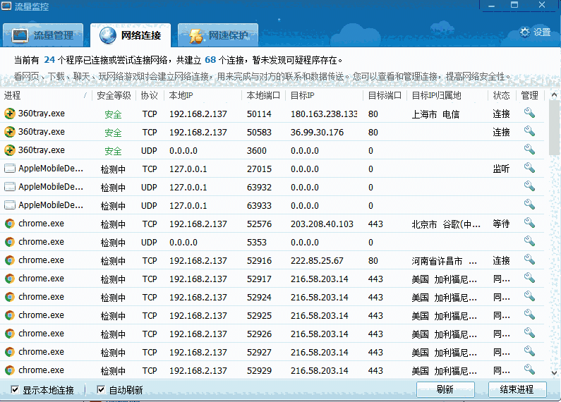 检测进程的本地IP端口和目标ip端口以及ip的归属地
