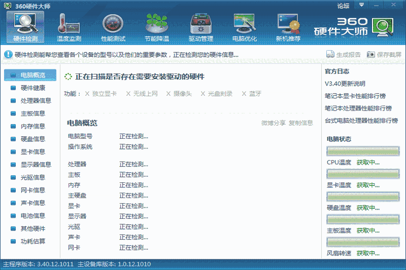 360硬件大师官方版温度监测功能可以帮您实时了解电脑当前各类硬件的温度情况,当硬件温度过高的时候会发出高温警报,提醒您预防温度过高可能导致的硬件烧毁悲剧。