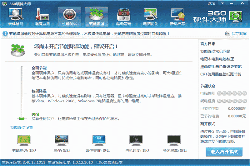 夏天到了,电脑温度越来越高,风扇越来越响,难道就只能用加装散热架,拆开机箱挡板进行散热了么?别急,先试试节能降温功能!它能够在您电脑温度过高的时候,自动帮您降低5~10摄氏度的温度,等到电脑温度下降到安全范围之后,就会停止降温,避免影响电脑性能!赶紧试试看吧。