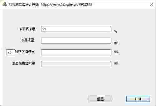 75%浓度酒精计算器官方版软件默认计算95%酒精稀释75%酒精:输入已有的浓酒精量计算稀释到X%浓度酒精需要加的水