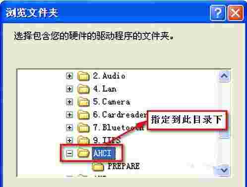 5、在弹出的的浏览文件夹选项中,找到你刚才解压后的AHCI驱动根目录,找到后点击【确定】就可了。
