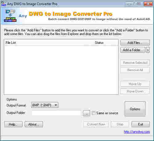 Any DWG to Image Converter是一款专业的DWG格式CAD图纸文件的转换工具软件。软件可以帮助使用者将CAD图纸文件格式dwg转换为JPG图片文件格式,支持批量转换,可以节省一次次转换的时间,提高转换效率。软件还支持转换为其它图片格式。
