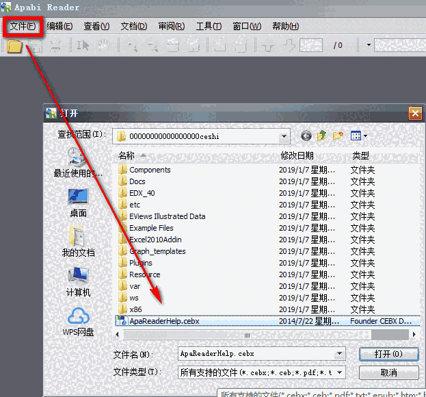 2、进入打开文档界面后选择Apabi Reader支持的文档格式文件,并单击【打开】按钮。