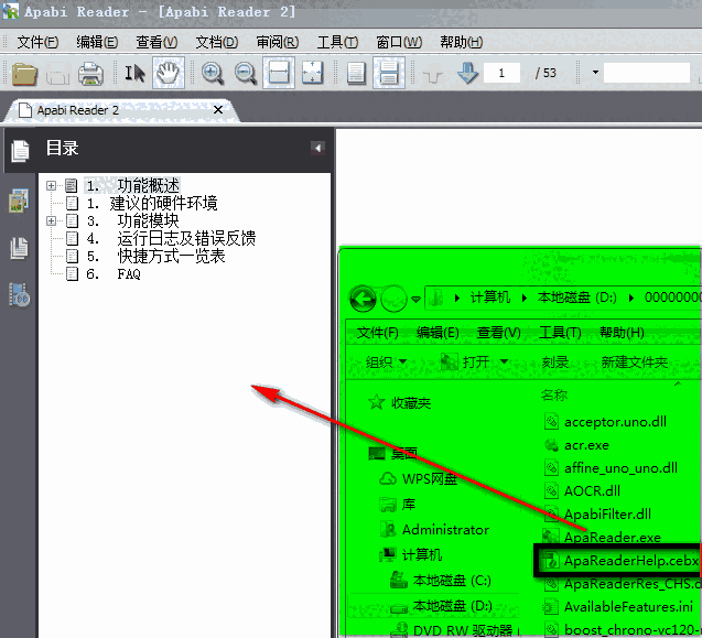 直接将Apabi Reader软件跟文档打开,然后拖拽你需要打开的文档,直接拽至软件界面内即可打开显示。如下: