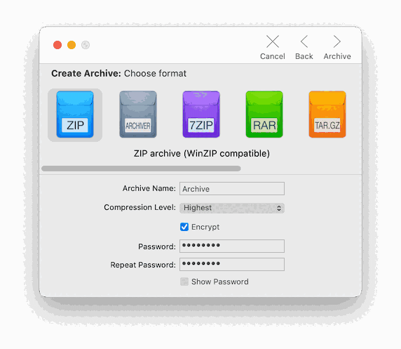Archiver Mac版是一款非常实用的压缩软件,软件操作简单且功能强大,支持所有的格式压缩和解压缩,包括7z、Zip、RAR、7zip、Tar、cab、jar、pkg、deb、zipx、gz等,拥有压缩包加密、分卷压缩、压缩包内图片和音乐优化、压缩包内容预览等功能,还可以为压缩的文件设置密码,以及对大的文件进行切割处理,感兴趣的赶快下载使用吧!