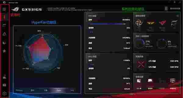 “首页”中间位置为HyperFan功能区,下方有五个选项用于调节风扇及性能模式,上方则显示不同模式下对机台性能、噪音以及功耗的影响程度。