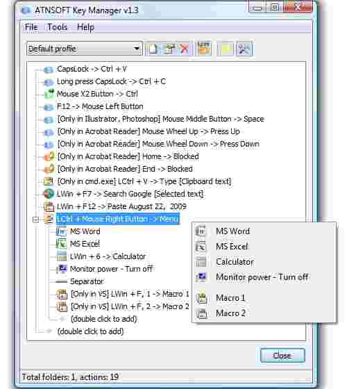ATNSOFT Key Manager允许您为常规、连续和长按(按住)键、鼠标按键、鼠标滚轮旋转、与修饰符的组合以及弹出式菜单项分配以下操作。