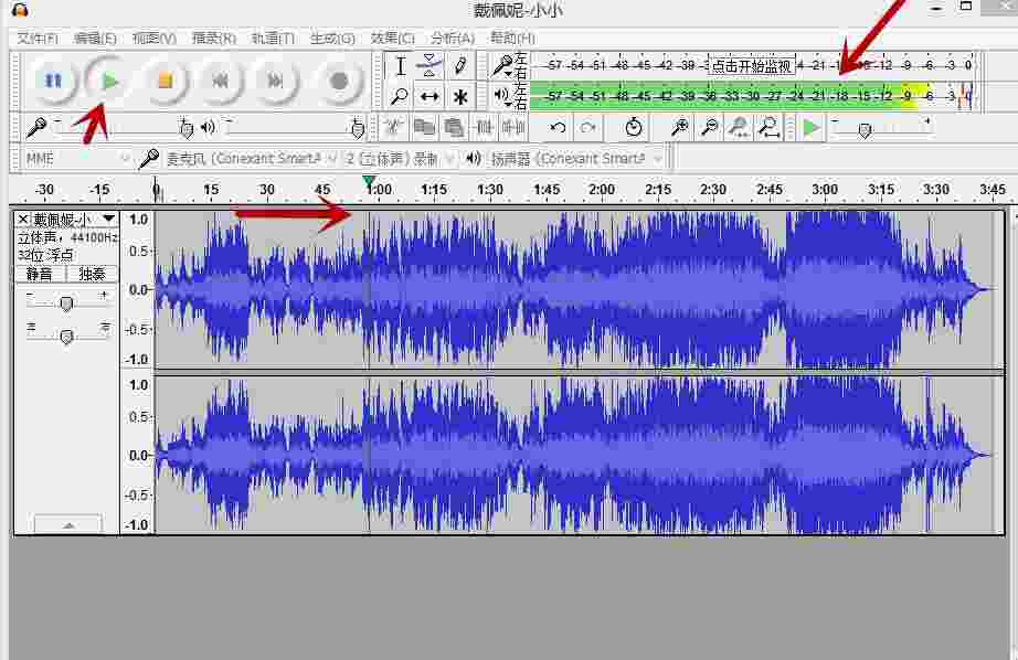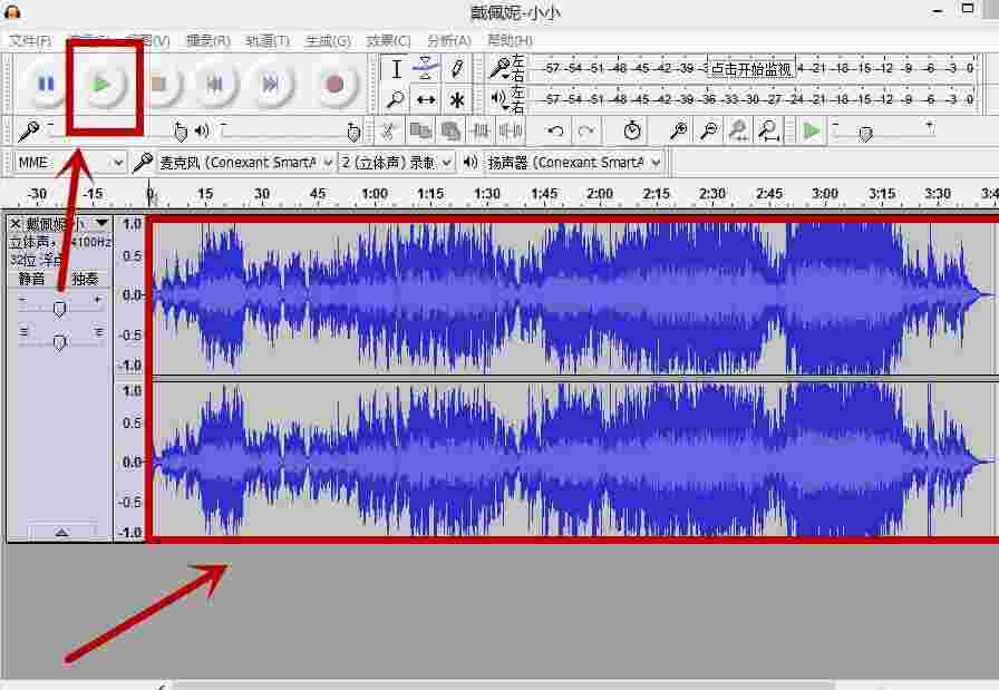 3、点击audacity菜单栏左下方的播放按钮,您可以试听音乐。