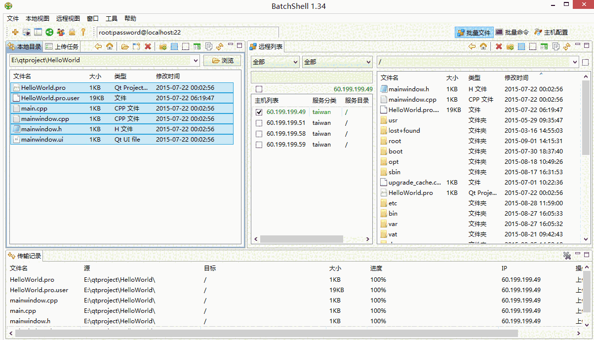 BatchShell是一款专业的文件传输和命令执行的软件工具,软件支持多服务器批量文件传送、接收、远程命令交互等功能。非常方便快捷,软件界面简约,布局直观清晰。操作简单,容易上手,是一款十分实用的工具。