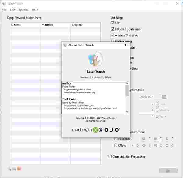 BatchTouch 提供了一种易于使用的方式来一次性更改多个文件和文件夹的创建和/或修改日期。它为用户提供了足够的灵活性来选择要更改的项目类型、是否处理文件夹的内容以及是否更改创建日期、修改日期或两者。